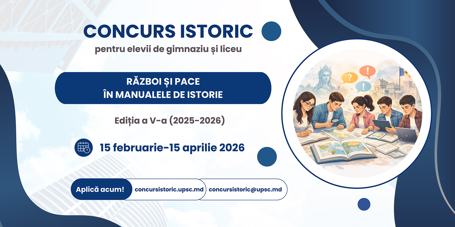 Participă la CONCURS Pasul 1 Date participant Pasul 2 Încarcă lucrarea Pasul 3 Confirmare Pasul 4 Feedback Pasul 5 Finalizare Rezultatele finale APLICĂ ACUM! Cerințe de participare la CONCURS Cerințe pentru Gimnaziu Cerințe pentru Liceu EDIȚIILE ANTERIOARE Retrospectivă: Concursul istoric la a V-a ediție PARTENERI Concurs istoric în Armenia, Georgia, Moldova și Ucraina. REZULTATELE NOASTRE ANTERIOARE Participanți elevi de gimnaziu și liceu 0 Lucrări lucrări depuse 0 Instituții instituţii de învăţământ 0 SCRIE MESAJ! Nume Email Subiect Mesaj Date de contact Telefon: +373 69 028 288E-mail: concursistoric@upsc.md Facebook-f